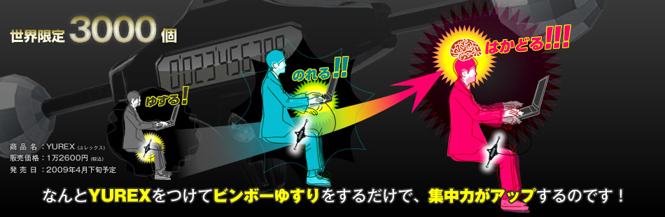 集中力を高める新アイテムが密かに誕生してました!それは、必要な方にはなんて利にかなった効率の良いアイテムだ!・・と、思わずため息が漏れる事必死!特に毎日デスクワークをしてる方は、まさにその場所がお金を生む戦場!必死で戦うビジネスマン!かっこいいよね〜!そう!戦う姿とは、パリッとして格好いいものなんです!…が、しかし・・中にはあまり認めにくい姿もあり受け止められ無いのも事実;それが…そう!「貧乏揺すり」人によっては、不愉快と感じられる行動の1つ!それを根底から覆す!また、デザイン!!その名も「YUREX」その製品版がこれ!(画像にポインターを置いて下さい)どうですか!もうこの時点で、ワクワクする方もいることでしょう!さて!お待ちかねの!使用方法ですよね!!・・これをどうするかと言えば・・まずこの装置・・YUREXを太ももに、とりつけ・・こうして!こうなって!こうなります!こうなるんです!・・・・・どうですか? お一つ;それでも判らない方は・・画像をクリックしてね!もっと判るリンクはこちら↓明和電機これからは、貧乏揺すりも「インナービート」と呼びましょう!インナービートで集中力アップ!!